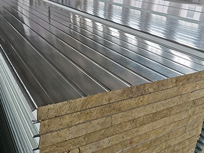 鍍鋅巖棉夾芯板其上下表面采用一面鍍鋅板一面彩鋼板或雙面鍍鋅鋼板,厚度為0.4-0.8mm。通過(guò)自動(dòng)化連續(xù)成型機(jī),經(jīng)壓型后用高強(qiáng)粘合劑粘合而成。巖棉塊交錯(cuò)鋪設(shè),其纖維走向垂直于鍍鋅巖棉夾芯板的上下表面,并緊密相接充實(shí)了鍍鋅巖棉板的整個(gè)縱橫截面。巖棉塊之間和巖棉與上、下層鋼板之間通過(guò)高強(qiáng)度發(fā)泡劑粘接復(fù)合而成。鍍鋅巖棉夾芯板有很強(qiáng)的剛度,具有防火、保溫、隔音、隔熱等性能。